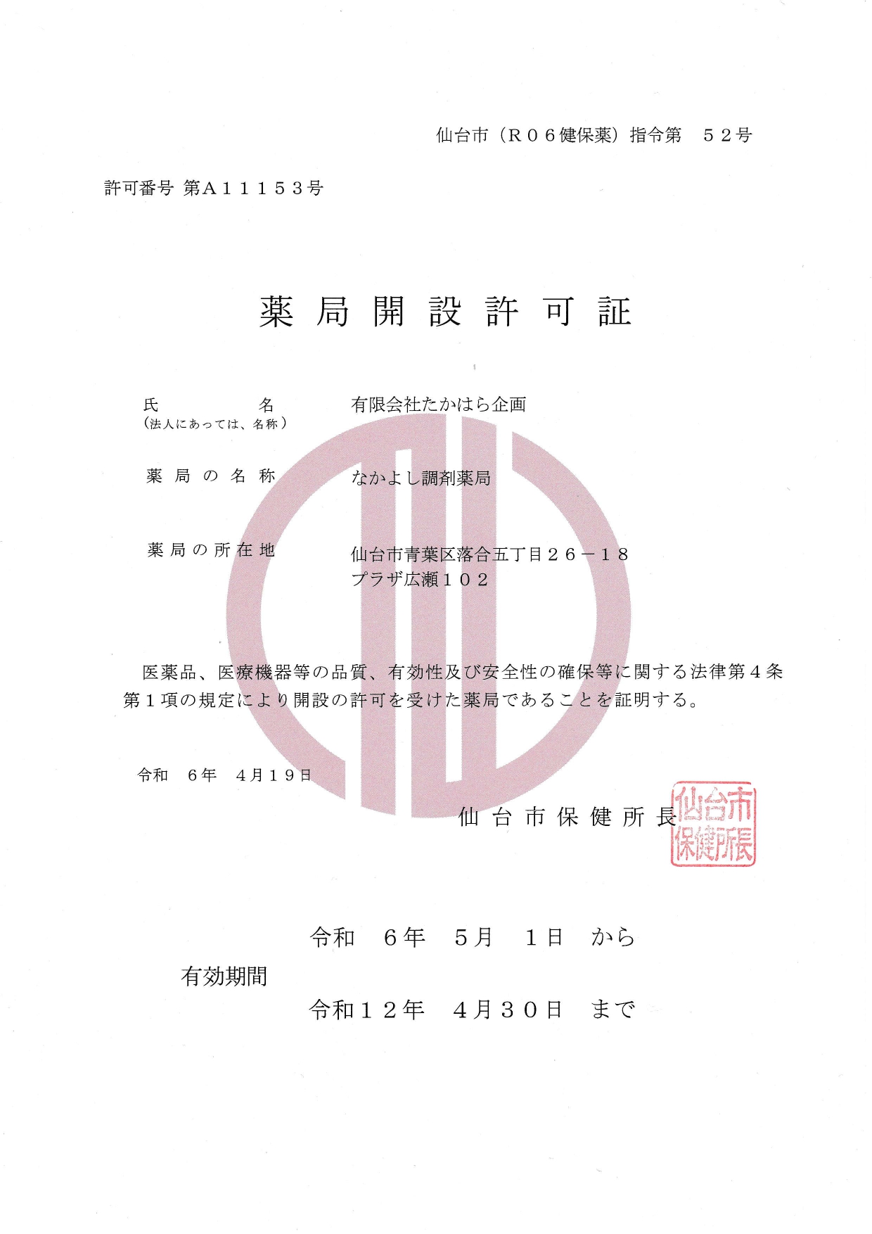 また当薬局では、休日、夜間を含む開局時間外であっても調剤及び在宅医療業務に対応できる体制を整えております。緊急を要する場合は(022-391-0508)へお電話をお願いします。営業時間外の調剤につきましては、お時間がかかる場合があります。また、時間外・休日・深夜加算が発生いたしますのでご了承ください。
